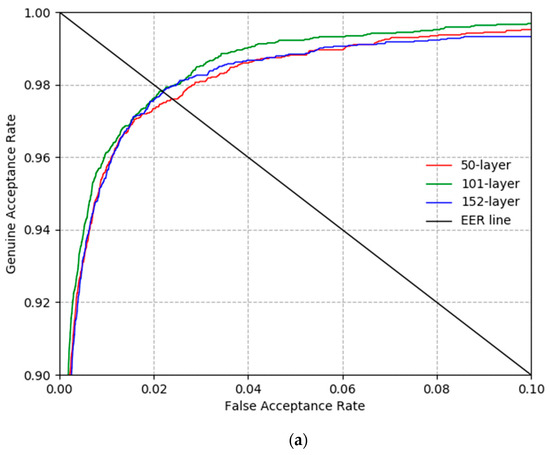 In normal biometric studies, recognition performance is measured under two settings: closed world and open world. In the former, the classes of data are the same during training and testing. In the latter, the classes of data are different during training and testing. Under normal scenarios in biometrics, the classes of data may or may not be the same during training and testing. Therefore, an open world setting is more suitable for real-world applications. This study evaluated recognition performance in an open world setting. During this type of classification for biometrics, the output of the CNN’s fully connected layer is used, or the feature vectors extracted from the layer before the last fully connected layer are used to perform matching based on the matching distance with the feature vectors of the enrolled images. In a closed world setting, the classes of the data are the same during training and testing. Therefore, the output of the CNN’s fully connected layer can be used as-is. However, in an open world setting, the classes of data are different during training and testing. Therefore, feature vectors extracted from the layer before the last fully connected layer are used to perform recognition based on the matching distance with the feature vectors of the enrolled images. This study obtained the matching distance using Euclidean distance based on 2048 feature vectors extracted from Table 2’s average pooling layer. If the enrolled and input images are in the same class (genuine matching), a small Euclidean distance is calculated for them. Conversely, if they are in different classes (imposter matching), a large Euclidean distance is calculated for them. In this study, genuine matching occurred when this Euclidean distance was smaller than the threshold, and imposter matching occurred when it was larger than the threshold. Based on the training data, the distance at which the false acceptance error (FAR) and the false rejection error (FRR) were the same was set as the optimal threshold. FAR is the error of incorrectly accepting imposter data as genuine data, whereas FRR is that of incorrectly rejecting genuine data as imposter data. In general, FAR and FRR share a trade-off relationship, and the error in case FAR is similar to FRR is called as the equal error rate (EER).