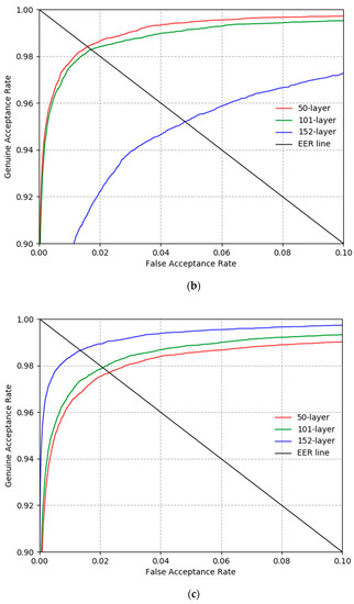 Figure 8 shows the recognition accuracy measured in Table 4 in more detail as a receiver operating characteristic (ROC) curve. The genuine acceptance rate is calculated as 1 −FRR. Each graph is the mean graph of the two graphs found in the two-fold validations. From the results in Figure 8, it is clear that ResNet-101 showed the best recognition performance for the CASIA-Iris-Distance database, ResNet-50 for the CASIA-Iris-Lamp database, and ResNet-152 for the CASIA-Iris-Thousand database.