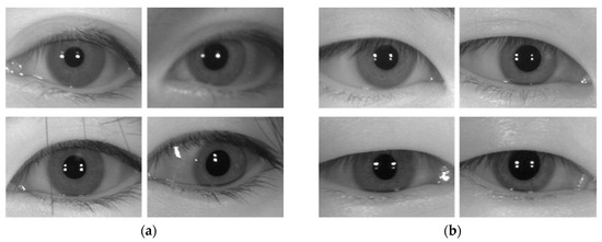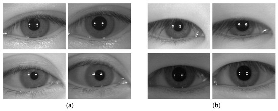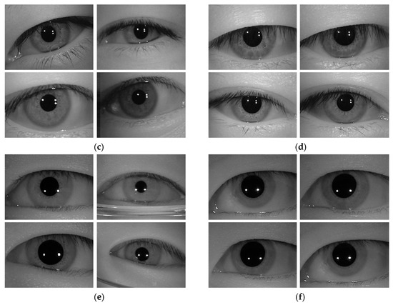 Examples of recognition error cases due to the method proposed in this study. (a,b) CASIA-Iris-Distance database. (c,d) CASIA-Iris-Lamp database. (e,f) CASIA-Iris-Thousand database. (a,c,e) are FR cases. (b,d,f) are FA cases. In (a–f), the image on the left is the enrolled image, and the image on the right is the recognition attempt image.