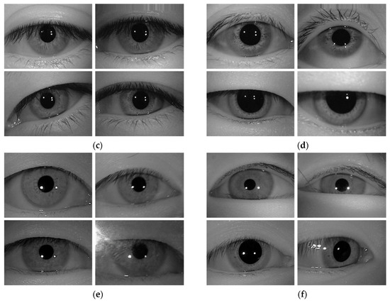 Examples of correction recognition cases achieved through the method proposed in this study. (a,b) CASIA-Iris-Distance database. (c,d) CASIA-Iris-Lamp database. (e,f) CASIA-Iris-Thousand database. In (a–f), the image on the left is the enrolled image, and the image on the right is the recognition attempt image.