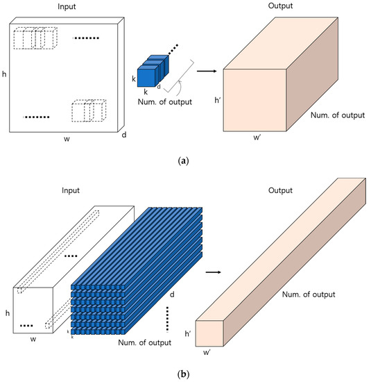 Example of obtaining output feature map via the convolutional layer. (a) Example of creating output feature map (w′ × h′ × Num. of output)) using as many as k × k filters of the same depth as the number of output on the input image (w × h × d). (b) Example of convolution calculations and finding the output feature map when the input feature map’s depth increases afterward.