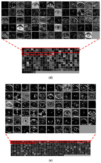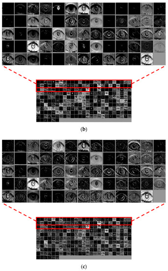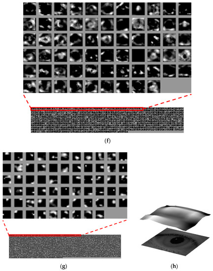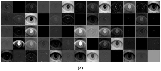 Based on Figure 11, this section analyzes the feature maps extracted from each layer of deep ResNet for the input ocular images as shown in Figure 12. As described in Figure 11, the output feature map’s depth increased as the layers became deeper. Because this is difficult to express in 3D form, the feature maps for each depth are shown in the order from the top left to the bottom right, as seen in Figure 12. Figure 12a shows the feature map from Conv1 of Table 2. Figure 12b–d show the feature maps from the first, second, and third iterations of residual blocks in Conv2 of Table 2, respectively. Further, Figure 12e–g show the feature maps from the last residual blocks in Conv3, Conv4, and Conv5 of Table 2, respectively. For example, the feature maps obtained from Table 2’s Conv1 have a size of 112 × 112 × 64; therefore, 64 feature maps of size 112 × 112 are shown in the order from the top left to the bottom right, in Figure 12a.