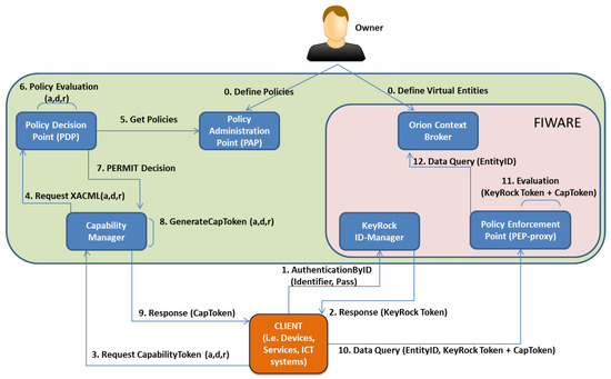 - Moldovan, G.; Tragos, E.Z.; Fragkiadakis, A.; Pohls, H.C.; Calvo, D. An IoT middleware for enhanced security and privacy: The RERUM approach. In Proceedings of the 2016 8th IFIP International Conference on New Technologies, Mobility and Security (NTMS), Larnaca, Cyprus, 21–23 November 2016; pp. 1–5. [Google Scholar]