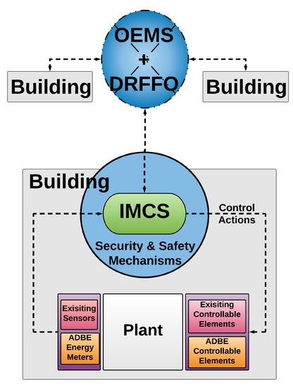 The PLUG-N-HARVEST architecture employs a closed-loop building control work-flow (see Figure 6). All sensors and actuators (i.e., the ones mounted on the ADBE and home automation infrastructure) are connected the BMS system including the security and safety mechanisms. Real-time measurements collected from such building sensors together with weather data (i.e., local weather stations and online forecasting weather repositories) are accessible to energy management systems (i.e., IMCS, OEMS and DFRRO) through the BMS system. According to the sensing data, IMCS generates and applies the optimized control decisions to the building actuators (i.e., available HVACs and ADBE HVACs, RES and energy storage) through the BMS system to constitute the closed-loop building control. The control cycle frequency depends on the application characteristics: in cases where quite slow dynamics with high inertia are involved, i.e., building thermal dynamics, the control frequency is set TC = 10–15 min. The control cycle is re-calibrated periodically (e.g., in building cases on a daily basis TR = 24 h).