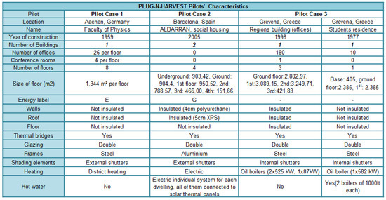 Three different large-scale pilots have been provided to demonstrate and evaluate the PLUG-N-HARVEST integrated system. The pilots are located in RWTH Campus, Aachen, Germany; Barcelona, Catalonia, Spain; and Region of Western Macedonia, Grevena, Greece, in order to cover different climate zones. The real-world pilots involve a varying usage pattern and both commercial (i.e., offices) and residential buildings. The main characteristics of the pilots are shown in Figure 8.