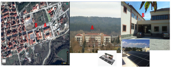 This pilot consists of two group of public buildings (see Figure 9) in the local Community of Grevena, Region of Western Macedonia, Greece: (A) public building of region hosts municipal authorities and municipal employees of Grevena city; and (B) residence for students hosts students of the professional school. The site consists of diversified buildings regarding the activities and users. Public building of region has a morning to noon operating and visiting hours, while the residence of students has much expanded operating hours program, even though in the morning hours the activity is lower. In the buildings, the heating system consists of oil boilers and heat pumps. Photo-voltaic system of solar panels are installed on the roof of the buildings to cover lighting consumption.
