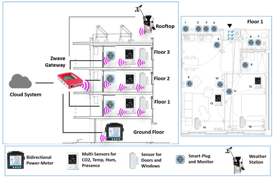 The right side represents the deployment in a building including five floors. In the building, all Zwave pieces of equipment are connected wirelessly with Zwave HA gateways providing the Internet connection with the PLUG-N-HARVEST system deployed in the cloud. The data exchange between building equipment and cloud system is performed by security-by-design protocols to protect against cyberattacks, as explained in Section 4.1.