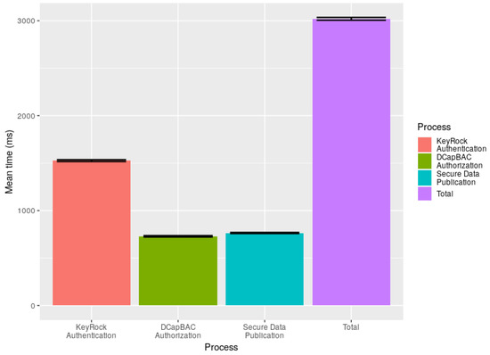 Figure 13 shows the times required to perform each above-mentioned phases of the security operations between the BMS system in the cloud and the RaspberryPI gateway in the building. First, the KeyRock authentication takes approximately a mean time of 1500 milliseconds. This time entails establishing a HTTPS connection with the KeyRock ID-manager for the identity validation and gathering the authentication token. Second, the DCapBAC authorization takes approximately a mean time of 700 milliseconds. This time also entails a HTTPS connection with the Capability Manager for access policies validation and getting the authorization token. Finally, the data exchange entails another HTTPS connection with the PEP-Proxy for validating both tokens and publishing/retrieving data into the specific virtual gateway of the BMS system accordingly. This takes approximately a mean time of 750 milliseconds. Since the generation and validation of the tokens are performed in the BMS system located in the cloud, the times obtained are very efficient and consistent, as can be observed by the small confidence intervals. These three phases take approximately three seconds to complete. However, the authentication and authorization phases are only required to start the secure communication with the BMS system. Therefore, every next data exchange presenting both tokens can be performed with the BMS system in only ≈750 milliseconds.