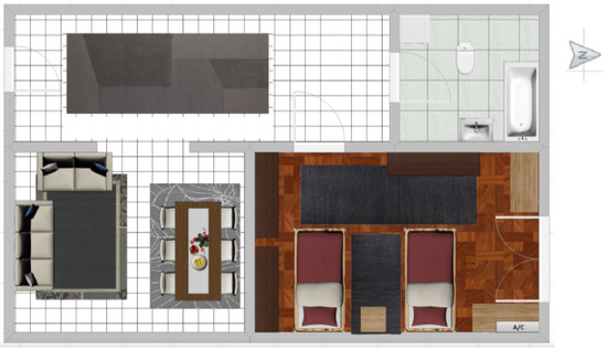 In the PLUG-N-HARVEST architecture, the IMCS module was verified in a small scale testbed consisted by a single room 19 m2 as part of a real pilot. The specific room communicates with the rest of the house through a typical indoor wooden door, which was kept closed during the tests to minimize the effects of losing heat simplify the validation of the results. Moreover, a big single-glass aluminum window is installed in the north facade of the room. On the other hand, the pilot does not have renewable energy sources (i.e., solar panel, batteries, etc.) (see Figure 14).