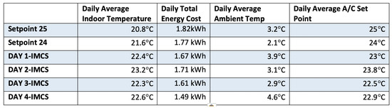 In the pilot, a typical commercial air-conditioning (A/C), 9700 btu is used as the climate control equipment deployed next to the corner where the north and west sides of the room meet. Moreover, a RaspberryPI gateway was installed in the exact same room acting as Home Automation (HA) gateway. This HA gateway monitors the room temperature and the A/C’s consumption by a wireless smart-plug device to turn on/off the A/C equipment. Figure 15 shows the preliminary experimental results obtained during January 2019 for four consecutive days. The objective of the preliminary tests was to reduce the power load of the A/C while achieving comparable, if not better, indoor thermal comfort conditions. The observed results accounted for the efficiency of the IMCS module on optimizing the energy consumption from 1.82 kWh to 1.49 kWh within only four testing days. The IMCS outperformed both the commonly used, typical set-point strategies, which consider the A/C temperature constantly set equal to 23 and 25 degrees Celsius. According to the results, the IMCS improved both energy consumption and the comfort-penalizing index, even during colder winter days. In addition, these IMCS results will be improved in the second stage of the pilots deployment that enables the management of adaptive dynamic building envelope (ADBE) and renewable energy sources (RES) for energy harvesting.