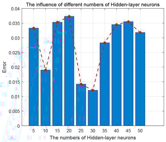 The validation of the proposed MBA-BPNN model is shown in Figure 4. This paper sets different number of hidden-layer neurons ranging from 5 to 50. Ceteris paribus, the error varies along with the numbers of hidden-layer neurons. When the hidden-layer neuron is 30, the error reaches the smallest 0.013.