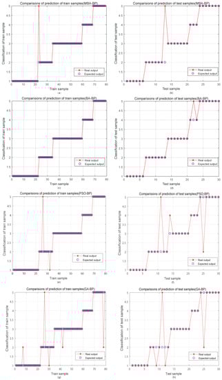 Figure 6 shows the ability of prediction among a few PHM models, the more points overlapping indicates a better prediction effect. Compared with other optimized models, BA outperforms other bio-inspired algorithms in predicting the output. It improves the ability of the trained model to predict that the output is closer to the actual value after acquiring the DGA data. Based on the same data sample, MBA-BPNN can easily avoid the problem of over-fitting. Therefore, the MBA-BPNN PHM model is an efficient tool for power transformer fault diagnosis.