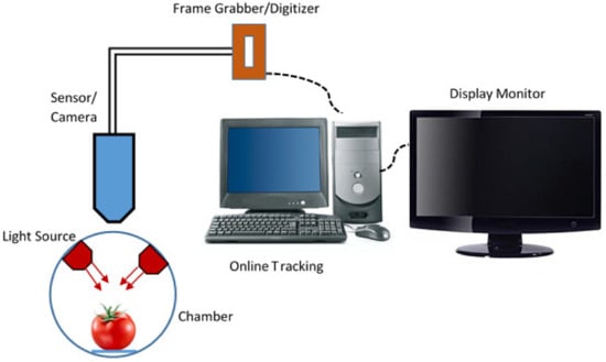 The use of machine vision in food processing has been improved significantly in recent years. Machine vision techniques are automatic, non-destructive, and perfectly suitable for food quality assessment. There are a number of fields in which computers are an intricate part, including terrestrial and aerial mapping of natural resources, crop monitoring, non-destructive evaluation of material quality, etc []. In machine vision systems, digital cameras with image analysis systems are used for the automation of visual reviews []. The machine vision system usually consists of five basic components: a light, an imaging unit, an image capture board, and the appropriate computer hardware and software []. The working principle of machine vision as shown in Figure 2. Machine vision can streamline dreary visual observing processes that take quite a while or require complex mechanisms to be completed. Martynenko [] confirmed that computer vision techniques showed changes in the density and porosity of ginseng roots during the drying process, consequently providing a strategic alternative to the requirement for checking complex electron optical microscope imaging. However, due to their biological nature the automatic examination of agricultural products has precision issues and problems that are not present in other fields. Although industrial products often have similar colours, shapes and sizes, the same agricultural products may display very different appearances from one item to another. The texture and colour of agricultural products are highly important after harvesting. Besides, the colour of the fruit surface of one piece of fruit may match the colour of an imperfection on the surface of another sample of the same variety [].
