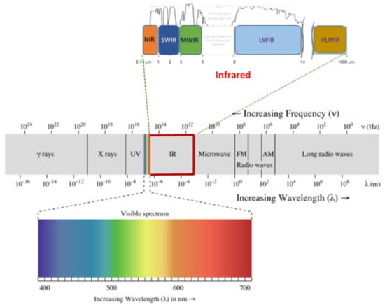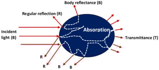The electromagnetic radiation of photons is divided into radio wave, microwave, infrared, near infrared, visible, ultraviolet, X-ray and gamma-ray ranges [] as shown in Figure 3. Within the infrared spectrum, the near infrared range of 780 to 1100 nm is known as “Herschel infrared”. Nonetheless, analytical use of spectroscopy in this region has been prevented by the difficulty in understanding the complex absorbance heights and because of its comparatively low energy compared to the visible region. Wei et al. [] reported that the visual spectrum can be designated according to the reflectance as UV (180–380 nm), visible wavelengths (380–700 nm) and near infrared (NIR, 780–2500 nm). The optical properties are characterized by reflectance, transmittance, absorbance, or scattering. Once the light rays fall on food, about 4% of the incident radiation is reflected by the material surface, while the other part is transmitted through the materials. The absorbed radiation is transformed into other forms of energy instantaneously such as heat, chemical changes or other forms of radiation such as fluorescence and phosphorescence as shown in Figure 4.