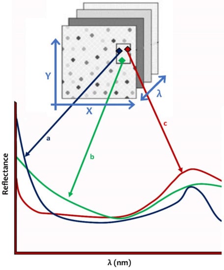 Hyperspectral imaging methods have been used for non-destructive evaluation of foodstuff quality. Hyperspectral imaging is also named spectroscopic imaging. A hyperspectrum is an influential spectroscopic system for non-destructive analysis that includes the recording of different numbers of images for different spectral groups. The amalgamated images and spectroscopy show concurrently the physical and geometrical properties of the food [,]. Through material investigation, exposure to electromagnetic radiation creates spatial maps named hypercubes [,], three-dimensional data including two spatial dimensions and a spectral dimension (Figure 5). Each hypercube contains 50–300 of images attained at different wavelengths with a spectral range of 1–10 nm. The fundamental standard which is practical is to combine the spectral data such as (1) the successive acquisition of two dimensional images with different wavelengths, and (2) getting the range of each area of an image in specific spectral region [,].
