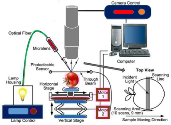 Hyperspectral imaging supplies a large pool of data according to the physical and chemical structure of an imaged material. Hyperspectral imaging as a synchronous source for obtaining spatial images in several spectral groups has been reported by Schaepman []. The hyperspectral imaging system contains a hardware and a software part with specific configuration changes created depending on the material and the image acquisition technique used. The hyperspectral imaging system contains a lighting source, a sensor which concurrently acquires spectra, a spectrograph, and a computer to produce the acquired images as shown in Figure 6 []. The applications of hyperspectral imaging in food analysis have been investigated in different studies. Hyperspectral imaging offers advantages such as speed, accuracy, and being a non-destructive analysis method that can be used along with the different production ways, concurrent valuation, and real-time information processing of a material’s chemical and physical properties [,].