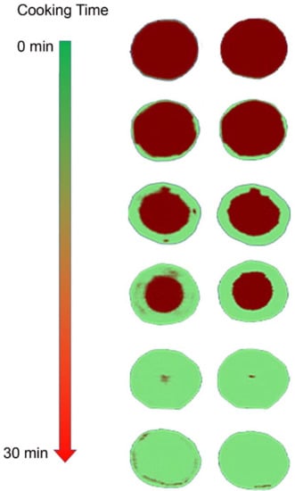 In addition, applications of hyperspectral imaging techniques to investigate the safety and quality characteristics of foods processed using different methods such as cooking, drying, freezing and storage have been reported. Application of hyperspectral imaging as a non-destructive method for predicting the core temperature (TC) and thermal history (TH) of Japanese seafood using the spectral range of 900–2500 nm was reported by ElMasry and Nakauchi []. To build the prediction model, partial least squares regression (PLSR) was used. The results showed high accuracy with RP2 of 0.86 and 0.83 for TC and TH, respectively. Additionally, the linear discriminant analysis (LDA) algorithm was applied to determine materials where the core temperature reached 65 °C, which represented the cut-off boundary between “cooked” and “uncooked” materials, yielding a classification accuracy of 93.8%. Do Trong et al. [] studied the hyperspectral imaging HSI method combined with chemometrics to monitor the cooking of potatoes. In the hyperspectral images of the potatoes, the pixels of the raw part, cooked part, and background were assigned values of 2, 1, and 0, respectively, using partial least squares discriminant analysis (PLSDA). The chemical images of cooked potatoes samples which were heated from 0 to 30 min could help monitor the cooking process (Figure 7).