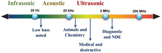 The physical reception of sound in any hearing organism is limited to a range of frequencies as shown in Figure 8. Ultrasound is an oscillating sound pressure wave with a frequency greater than the upper limit of the human hearing range. The ultrasound frequency is between 20 kHz and 2 MHz, while the range of human hearing is between 20 Hz to 20 kHz. It is known that soft tissues have a dampening effect on the sound produced when chewing food. Acoustic quality systems are a developing trend for non-destructive quality assessment of agro-foods. Acoustic techniques are based on the response to sound and vibration when the source is softly pinged []. The acoustic proceeding is significant for measuring the texture of foodstuffs. The source of acoustic emanation is an unexpected crash and as a result elastic waves proliferate in the foodstuff; however, texture assessment is based upon a number of crashes rather than spread characteristics. In the non-destructive method, the source of acoustic emission is a pendulum [,]. Texture properties are a mixture of visual inspection and auditory sensations, where the latter is based on cellular level procedures and the chemical bonds of the cells that influence sounds created by the breakage of cells in crisp foods. The textural characteristics of food gives high acoustic sensations. The force required to chew is responsible for crispness. The waves of sound pressure are created once the cells of materials are cracked [,].