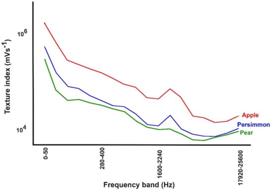 Calculated texture indices for apples, persimmons and pears with texture index versus frequency (modified from []).