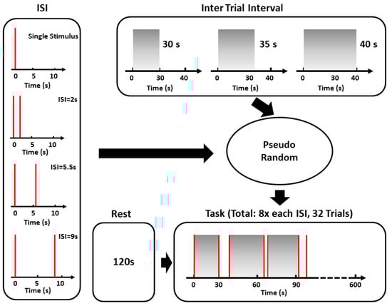 An event-related stimulation paradigm was employed in accordance with previous work performed on SCR [] (Figure 1). White noise sounds (1 s length; 10 ms onset and offset ramp; ∼85-dB sound pressure level) were delivered via a speaker in two event-related experimental conditions: single and double stimuli with an inter-stimulus interval (ISI) of 2 s, 5.5 s, or 9 s []. This was done to avoid subjective expectations about subsequent stimuli. The last stimulus of each trial was followed by 30 s, 35 s, or 40 s of silence. The first trial was preceded by 10 s of silence. Eight trials were realized for the single and double (eight for each ISI) stimuli conditions, for a total of 32 trials. Before the start of the white noise administration, a period of two minutes of rest was recorded.