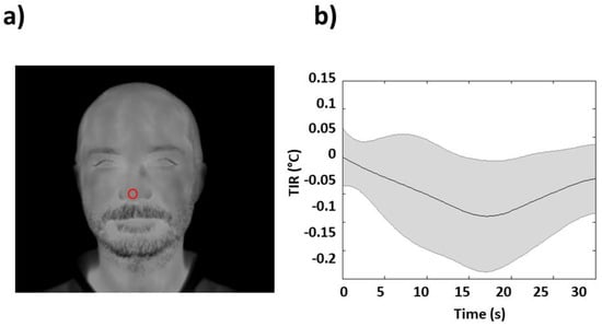 Functional infrared imaging (fIRI) is a non-invasive methodology that is employed in biomedical applications to evaluate the skin superficial temperature of a body, providing spatial and temporal information in a contactless modality. This technique is widely employed to infer autonomic arousal through the modulation of cutaneous temperature, which is a known expression of the psychophysiological state of the subject. In particular, fIRI often exploits time-dependent variations of the skin temperature of the face to infer sympathetic and parasympathetic responses []. In fact, skin temperature is modulated by vasodilatation and vasoconstriction, which are themselves regulated by autonomic activity. Moreover, sweat secretion, which is induced by the sudomotor nerve [], greatly influences skin temperature by increasing its heat conductivity. The amplitude of thermal changes is informative of the autonomic arousal only if there is a monotonic relation between the autonomic activity and the amplitude of the temperature oscillation. Evidence from the literature allows inferring that thermal skin variations produced by a stimulus are monotonic with the intensity of the stimulus; thus, it can be supposed that the above sentence is valid. For example, Yoshida et al. [] demonstrated that participants exposed to white noise aversive stimuli at four different pressure levels (40 dB, 50 dB, 60 dB, and 90 dB) exhibited a decrease of the nose tip temperature, which was correlated with noise intensity [].