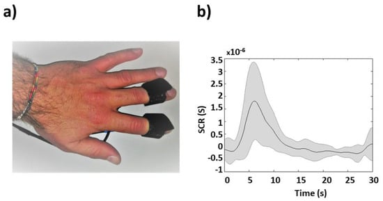 (a) Placement of finger electrodes for skin conductance response (SCR) measurements on the thenar/hypothenar muscles of the non-dominant hand. (b) Grand average, and associated STD, SCR to a single white noise stimulus.