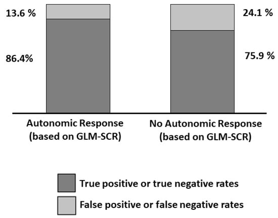 As described in Section 2.7, the GLM-fIRI results were compared to statistically significant activations of the GLM-SCR, assuming the GLM-SCR as the gold standard procedure. This meant that only the events detected by the GLM-SCR technique were considered indicative of autonomic arousal. The results of this analysis are described through the confusion matrix reported in Table 2 and Figure 5.
