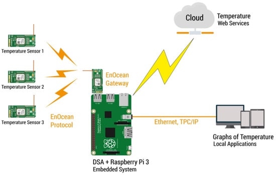 The prototype implementation of the proposed system uses a weather web service and physical temperature sensors under DSA (Distributed Services Architecture) open source platform for IoT [23]. The main goal of the DSA is to unify multiple devices, services and application in real time, structured and adaptable data model. To achieve this, we employed an embedded system Raspberry Pi 3 as a DSA server to control the system using a distributed server link (DSLink) to enable data exchange with other connected sensor nodes, as a weather web service in the cloud that uses Yahoo Weather API [24], and a communication protocol for receiving physical sensors data by means of EnOcean®protocol [25,26,27]. Figure 1 shows the IoT architecture of the prototype development.