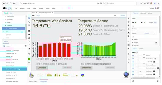 In addition to the embedded system, the DGLux5®program, integrated in the DSA server, allows to work with real time data to ensure the design and deployment process can be shown satisfactory on the different temperatures from physical sensors and the weather web service. The visual programming language to designing the front-end was performed connecting blocks that represent different operations. In the dataflow, to display the various temperatures and save the values in a database, the blocks were dragged and placed to be connected.