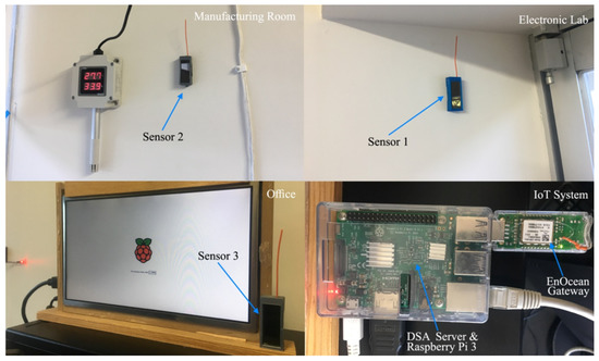 For this prototype implementation, the temperature sensors were located physically in three different locations inside a building of the Faculty of Engineering in Universidad Panamericana (Aguascalientes, Mexico). Sensor 1 was located on an electronic laboratory; sensor 2 was placed in a manufacturing room; and finally, sensor 3 was positioned on an office. Figure 3 shows the locations of the three sensors inside the building, while Figure 4 shows the inside enclosures where the sensors were placed.