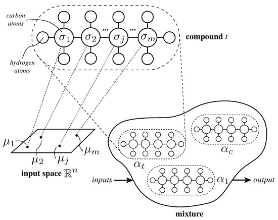 Two or more unsaturated molecules, i.e., those with hydrogen atoms, can be joined together. In AHN, this structure is called a compound. Different compounds have been defined in literature [40,42,43]. The simplest one is the saturated and linear chain of m molecules. It is composed structurally of two molecules with three hydrogen atoms and molecules with two hydrogen atoms. The behavior of a saturated-and-linear compound is defined as (2); where, is the behavior of the jth associated molecule that represents a subset of the input x such that , and is the center of the jth molecule [44,45]. In fact, if . In this regard, literature reports extensive usage of AHN with a single saturated-and-linear compound [40,41,43,44,45,46].