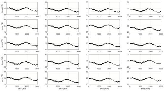 We simulated three WSN with different number of nodes, ranging from and 100. In this case, each sensor node simulates the measurement of indoor temperature in different locations. Data were simulated using a pseudo-stochastic periodic function and random values in the frequency and translation parameters. Figure 8 shows thumbnails of sensor nodes in the experiment with , only in the testing data.