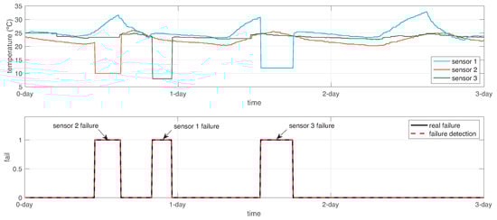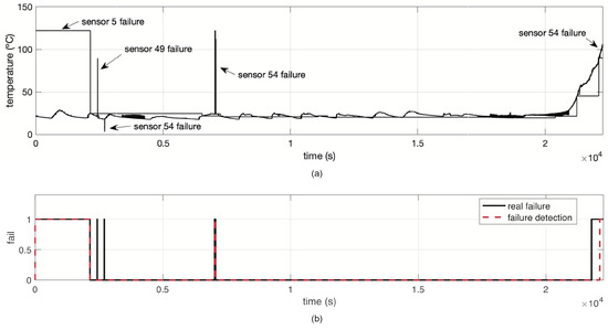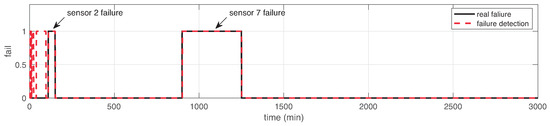 We applied the proposed SFDIA with AHN of Algorithm 2. After completion of the SFDIA strategy, this experiment reported an accuracy of in failure detection phase. Figure 12 shows the testing data set with some failures, and the comparison between the estimated failure detection and the real failure. It can be observed that some regions of false-negative values are estimated. Unfortunately, the proposed SFDIA strategy cannot correct sensor failure detection in the latter regions. Nevertheless, this experiment validates the feasibility to detect sensor failures in an accurate way over real data.