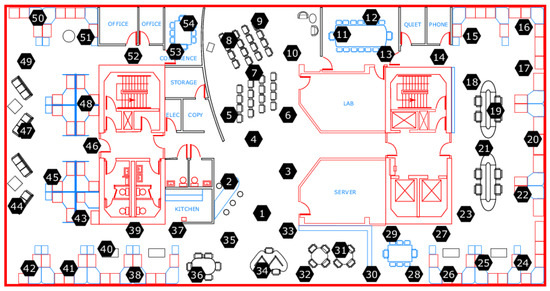 Location of the sensor nodes in the Intel Lab. Layout taken from [47].