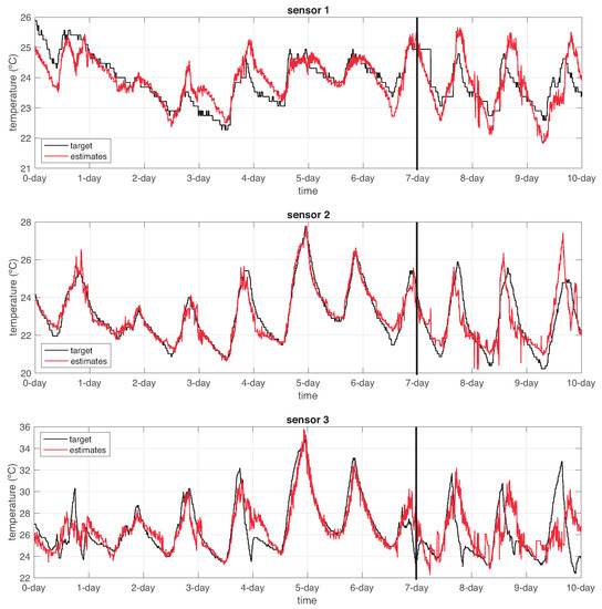 Figure 13 shows the output response of the temperature sensor AHN-models. As observed, the left part depicts estimation over the training data and the right part depicts estimation over the testing data (722 samples representing three days). Table 2 summarizes the root-mean-squared error (RMSE) in the estimation for both training and testing in all the physical sensor nodes.