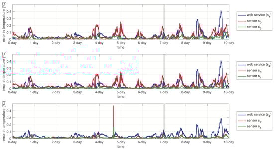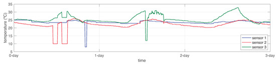 We conducted a series of experiments over the WSN, described in Section 2, to evaluate the performance of our proposed SFDIA strategy based on AHN. Three enclosed temperature sensors () and a temperature remote web service () were considered as sensor nodes (). We collected 2409 temperature samples from all the sensor nodes during ten days in a non-uniform way (no sample rate defined).