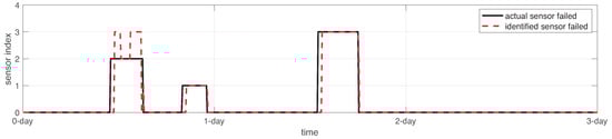 To this end, the sensor identification served for sensor accommodation. In this regard, failed values from sensors were changed by estimations from sensors , as shown in Figure 17. Notice that only of testing data failed to be recovered.