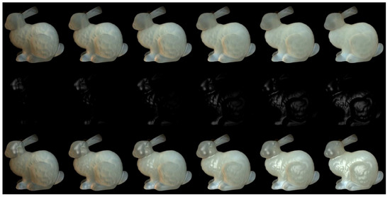 We used Stanford bunny object with two materials which are from Jensen et al. [21] and Narasimhan et al. [33] in our experiment: marble and chocolate milk (regular). Our method can preserve the details of both the solid and liquid translucent material. In all experiments, the resolution of the resulting image is 512 × 512 pixels, and the maximum intensity of the generated highlight is set to 0.35. For marble material, in Figure 3 and Figure 4, the selected region (red closeups) has 1440 pixels, in Figure 5, the selected region (purple closeups) has 20,720 pixels. For chocolate milk (regular) material, in Figure 6, Figure 7 and Figure 8, the selected regions are the same as in the marble material. In every row of Figure 3, Figure 4, Figure 6 and Figure 7 from left to right, the , parameters are is 2, is 2; is 2, is 10; is 10, is 2; is 10, is 10. In the results of Lafortune-based methods (Figure 5; Figure 8), the exponent parameter k is 10. is 1, and, from left to right, the , parameters are is 0.2, is 0.5; is 0.5, is 0.2; is −0.2, is −0.5; is −0.5, is −0.2.