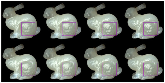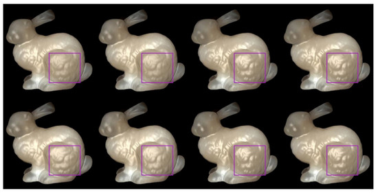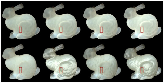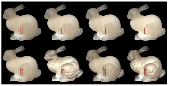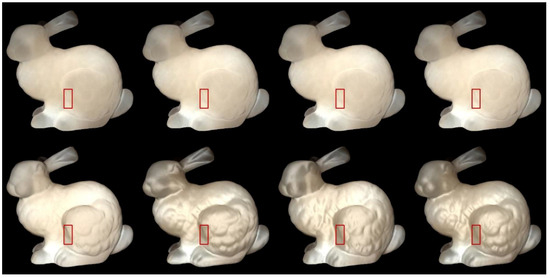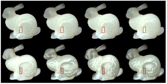 For methods based on the Lafortune model, we chose the bunny’s leg region for numerical analysis (purple closeups in Figure 5; Figure 8). From Table 1 and Table 2, in the proposed method, when is 0.2, is 0.5, and when is 0.5, is 0.2, and it is evident that the values of number and average intensity are smaller than those in cases when is −0.2, is −0.5 and when is −0.5, is −0.2. This can be seen from the weaker appearance intensity of the preserved bunny leg’s details in the rendering results; In the results of methods based on the traditional Lafortune model, when is 0.2, is 0.5 and when is 0.5, is 0.2, and the values of number are distinctly larger and the values of average intensity are a little smaller than the values in cases when is −0.2, is −0.5 and when is −0.5, is −0.2.