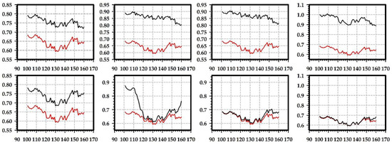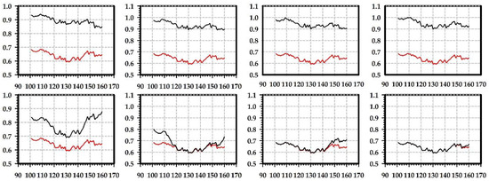 Illustration of generated highlight intensity distribution for the selected column of pixels with the marble material. First row: highlight effects generated by our Ashikhmin-based method, where images from left to right correspond to images of the first row in Figure 4; second row: highlight effects generated by the method based on the traditional Ashikhmin model, where images from left to right correspond to images of the second row in Figure 4 and the , parameters are is 2, is 2; is 2, is 10; is 10, is 2; is 10, is 10. In each image, the x axis is the vertical coordinate position of a pixel in the selected line and the y axis is the intensity value of the pixel.