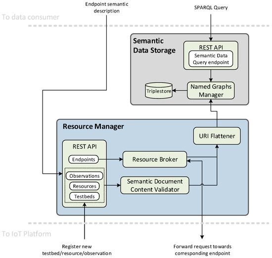 The Resource Manager (RM) main objective is to supervise how IoT data is registered, that is, how the underlying IoT platforms push their resources’ descriptions and the generated observations. RM entry point is tightly coupled with the underlying IoT Registry semantic storage database structure, as depending on the origin and nature of the data, the storage reference differs. Initially the RM has to only choose between the resources or observations graphs.