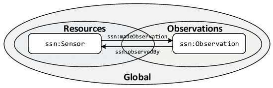 Based on the two identified realms, testbeds and its resources, and the observations collected in Figure 2, we introduced the high-level organization of the TDB. The approach followed for the IoT registry TDB considers two graphs, one for resources and another for observations’ descriptions. This provides a basic structure to the information stored, making it possible to focus the target when requesting or storing data. The dataset is also configured so that the default graph (named as Global in Figure 2) is defined to be the union of the two. The identifier of the sensor that made the observation is the link between the two realms. From the semantic point of view, the subjects and objects related via the properties ssn:madeObservation and/or ssn:observedBy are ssn:Observation and ssn:Sensor. As the sensor is referenced in both realms, the inference engine can establish the required relationships. As it has been previously mentioned, the IoT Registry design is not bound to any ontology; however, for the sake of clarity in the description we are using the concepts and relations from the FIESTA-IoT ontology [43], which is the one that we employed for the reference implementation that we have developed.