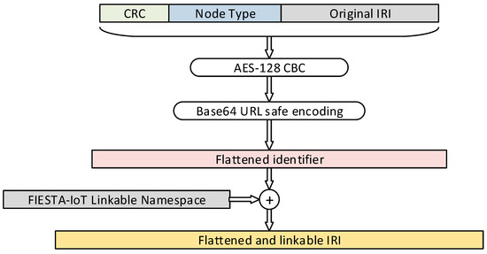 - The original URI is prepended by a Cyclic Redundancy Check (CRC) or a short summary of any hash function made over the original URI and an integer which represents the entity; and the entity type, which is an identifier of the entity (e.g., testbed entities are represented with the NodeType 0x03).