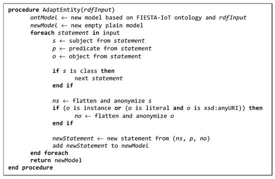 Therefore, the RM has to analyze all the triples posted by testbeds in order to identify classes instances and, for FIESTA-IoT specific case, iot-lite:endpoint references. Implementation-wise, we can rely on several SPARQL queries and the subsequent generation of the new semantic model. However, we have opted to take advantage of Jena functionalities, especially those related with OntModel, as it provides a better integration and coding experience. Figure 4 shows the pseudocode of the procedure.