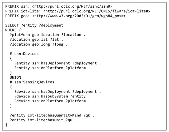 Figure 5 shows an example of a minimal document validation SPARQL. This SPARQL query is applied to the RDF document posted, and no interaction with IoT registry’s TDB is required. The outcome of the execution of the SPARQL sentence is a list of resources whose description meets the minimum set of information as defined by the FIESTA-IoT ontology. Besides, another SPARQL query extracts the list of linked resources within the RDF document; both lists must match. Otherwise, it would mean that the RDF document is including invalid descriptions. Once this first check is passed, it is verified that the deployments or IoT platforms associated are already registered in the TDB. Initially, and based on the semantic approach taken, it could seem that the simplest way this can be done is through the execution of another SPARQL request on the TDB. However, in order to minimize the amount of time spent on the validation procedure and reduce the amount of tasks run on the TDB, we have taken an alternative path. As the list of underlying platforms registered can be considered quite static and not very large, we can keep it either in memory or in a relational database. Then, matching the presence of platforms in both lists is straightforward.