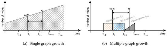 Figure 7 presents the reduction in the total number of RDF statements per graph of the proposed solution. Following the previous example, where a SPARQL query to retrieve observations in a specific time interval would search into the whole graph (see Figure 7a), with the implemented configuration, the IoT registry only attach graphs observations-Ti−1, observations-Ti, and observations-Ti+1 to the process (Figure 7b), significantly reducing the time and complexity of the search.