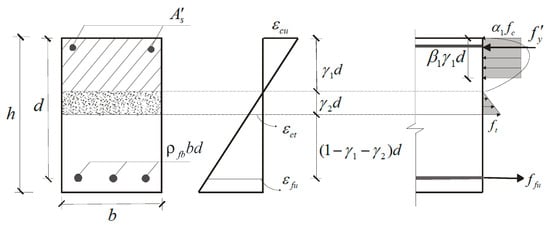 For beams that are damaged due to concrete crushing, based on the strain and stress conditions displayed in Figure 2, strain compatibility and force equilibrium are considered as follows: