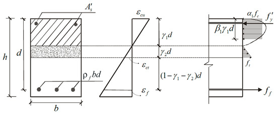 The balanced failure refers to the failure mode in which the FRP tendons reach their ultimate tensile strain (εfu) and the concrete reaches its ultimate compressive strain (εcu) simultaneously. The corresponding reinforcement ratio is the balanced reinforcement ratio (ρfb), which is the theoretical demarcation point to identify the failure mode of FRP-RC flexural members. At maximum load levels, FRP-reinforced beams generally experienced significant flexural cracking, although the fibers were added in the concrete [13,17]. Considering the fact that the fibers were pulled out or ruptured in cracked section, the tensile loads could not be transferred across the cracks by the bridging of fibers. Therefore, it is assumed that the concrete tensile stress in pre-cracking tensile zone (γ2d) distributes linearly, while concrete tensile strength in cracked section (d(1 − γ1 − γ2)) is ignored (Figure 1). In addition, the following assumptions are made for the calculation of the ρfb and the ultimate moment (Mu) of FRP–FLWC beams: