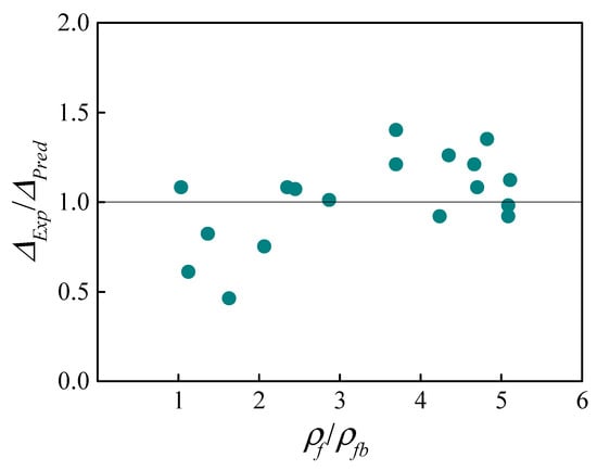 The results in Figure 4 indicated that the estimations were generally in good agreement with the experimental results, although the definition of the service load given by the researchers was not unified. However, specimens with higher ρf/ρfb tended to yield higher experimental-to-predicted deflection ratios (ΔExp/ΔPred). It can be derived that the influence of ρf/ρfb on the Bs,f−F presented in Equation (13) was overestimated.