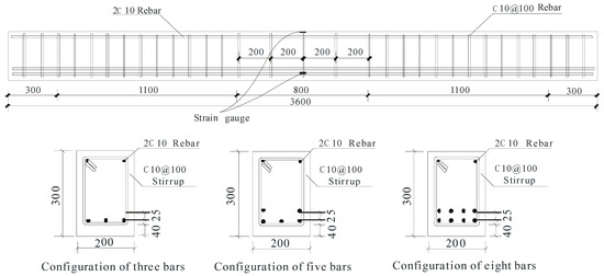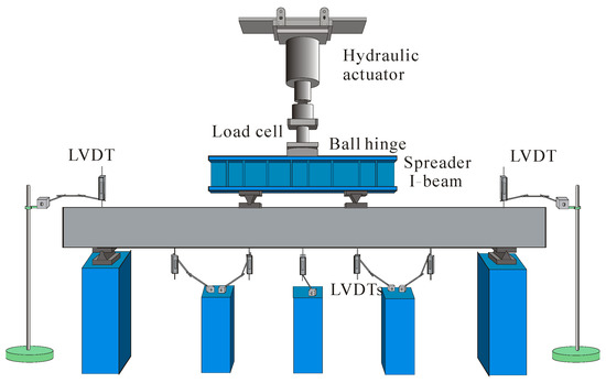 To study the influence of steel fibers and FRP reinforcement ratio, six GFRP-reinforced LWC beams were constructed and tested under four-point bending. Beam geometry and the loading and support arrangement are illustrated in Figure 5 and Figure 6, respectively. Strain gauges were installed on the FRP reinforcement at midspan and on the top surface of the concrete in the constant moment region to monitor their strain during the loading process.